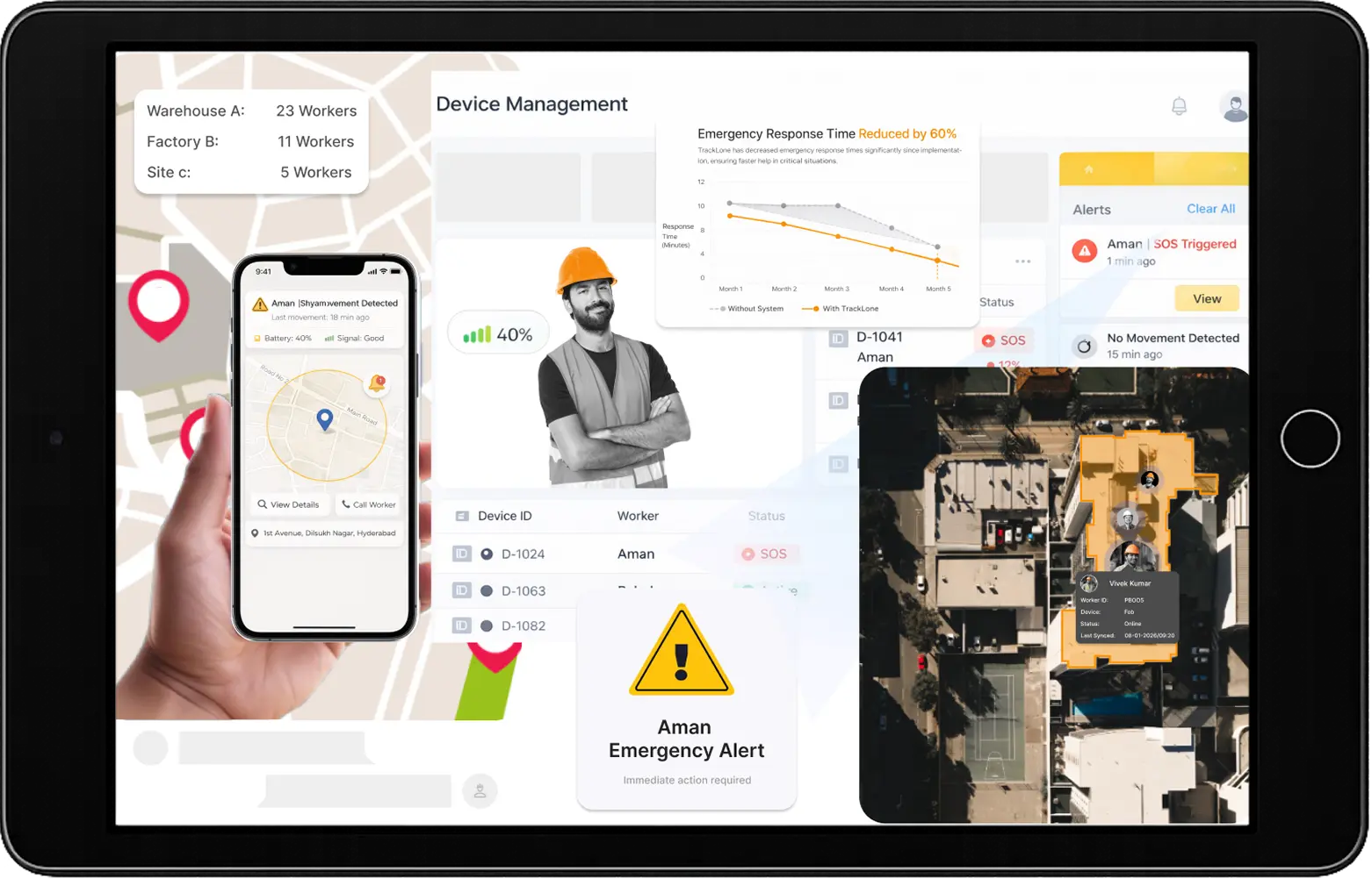 TrackLone supports centralized dashboards that allow organizations to onboard multiple sites, teams, and supervisors quickly, without complex setup, while maintaining consistent safety monitoring across locations.